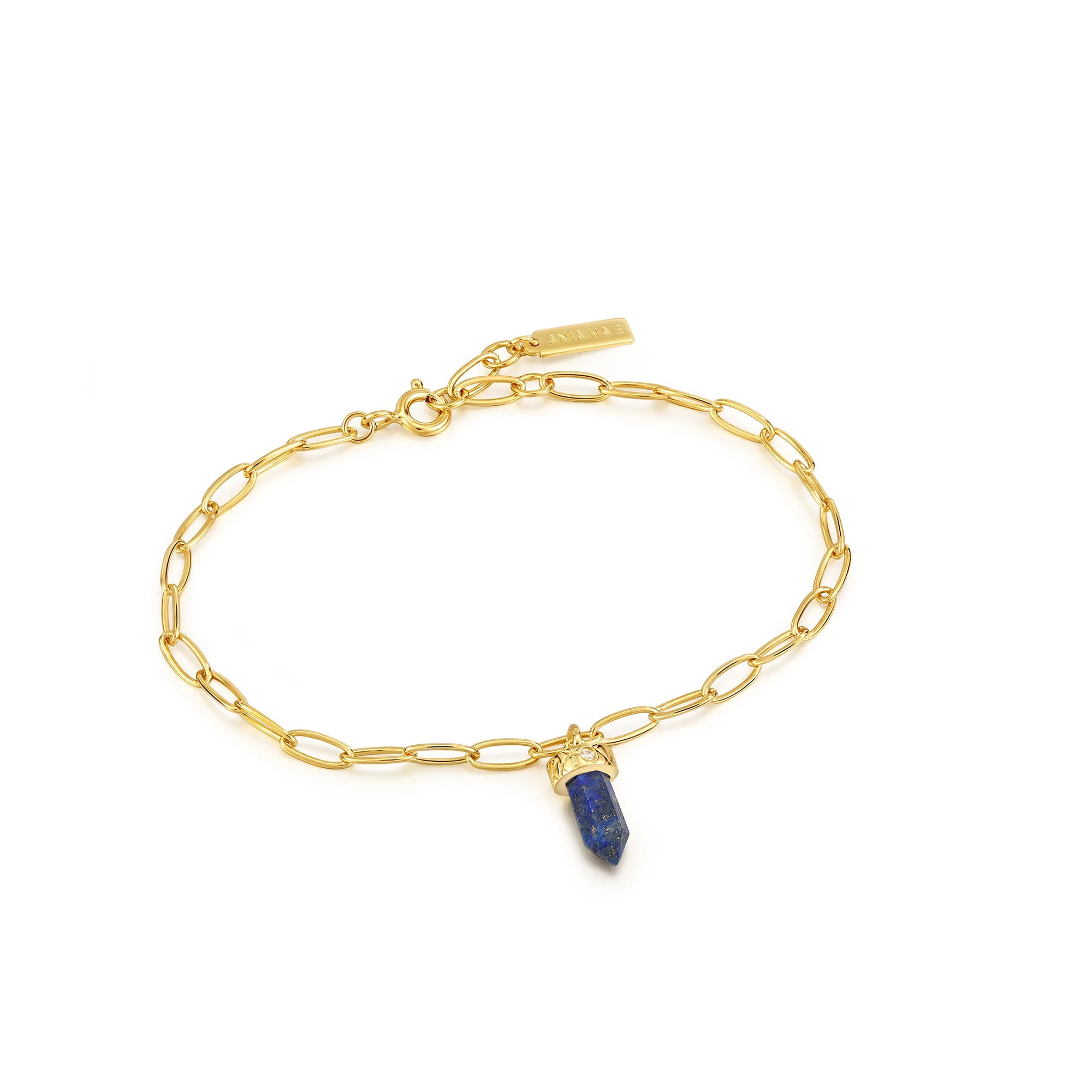 Make a spiritual statement this season with this spectacular lapis stone bracelet. The on-trend chunky gold chain is finished with a crystal point pendant crafted in deep blue lapis. Representing protection as well as deep peace and harmony for the wearer, the pendant is complete with shimmering cubic zirconia stones. A truly special way to add a spiritual crystal to your collection this season.